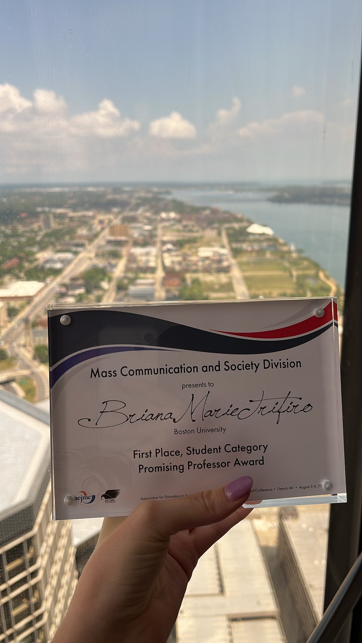 In 2022, I was awarded the Promising Professor of the Year Award by the Mass Communication and Society Division of the Association for Education in Journalism and Mass Communication. I was also awarded the Excellence in Graduate Teaching Award from Boston University in July 2022, the Excellence in Graduate Research Award from Boston University in July 2021, and the Distinguished Leadership Award from Boston University in July 2020.